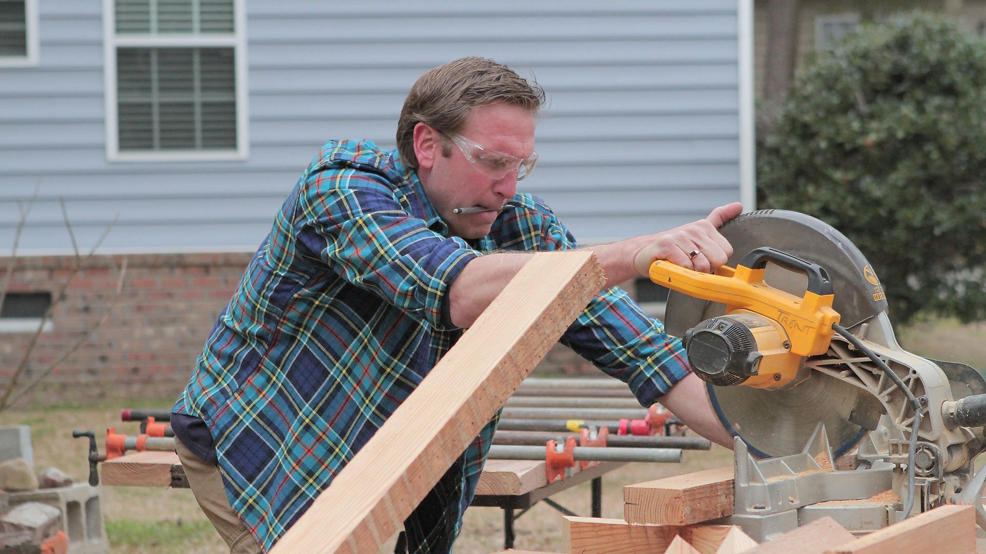 Licensed Contractor Trent Fasnacht rebuilds the kitchen in its original spot at the front of his 1906 country Victorian in Summerville, South Carolina, just outside Charleston. His design plan calls for custom bead board cabinets, a glass tile backsplash and authentic butcher block countertops. He also tries his best to save the original hardwood floors, the only remaining original floors in the house. After touring a recently renovated historic home in Charleston to get ideas for his kitchen, Trent borrows the idea of using a piece of furniture in place of cabinetry for his kitchen island.