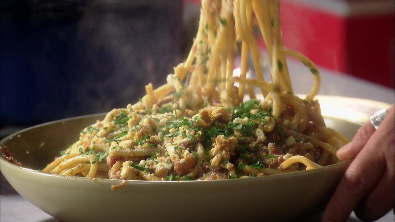 Guy Fieri cooks another on-point meal, this time featuring thick-cut country ribs braised in a red bell pepper sauce until outta-this-world tender. Alongside, Anchovy Bucatini and Pepper Peach Collins drive those sweet red bell flavors home. Red Pepper Pork, Anchovy Bucatini, Pepper Peach Collins.